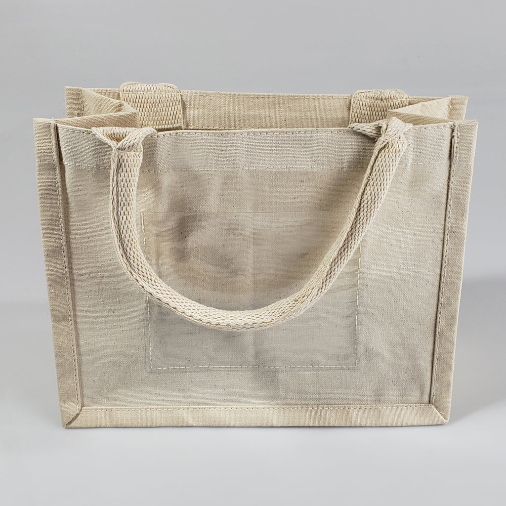 This canvas gift bag made from 100% cotton canvas fabric which is strong and durable, and they are made to last years of use with its reinforced stress points. The 14" handles are thick with woven jute sewn over a bundle of plush fibers for added durability. It has 4" x 5" clear plastic pocket to showcase cards or name tags.