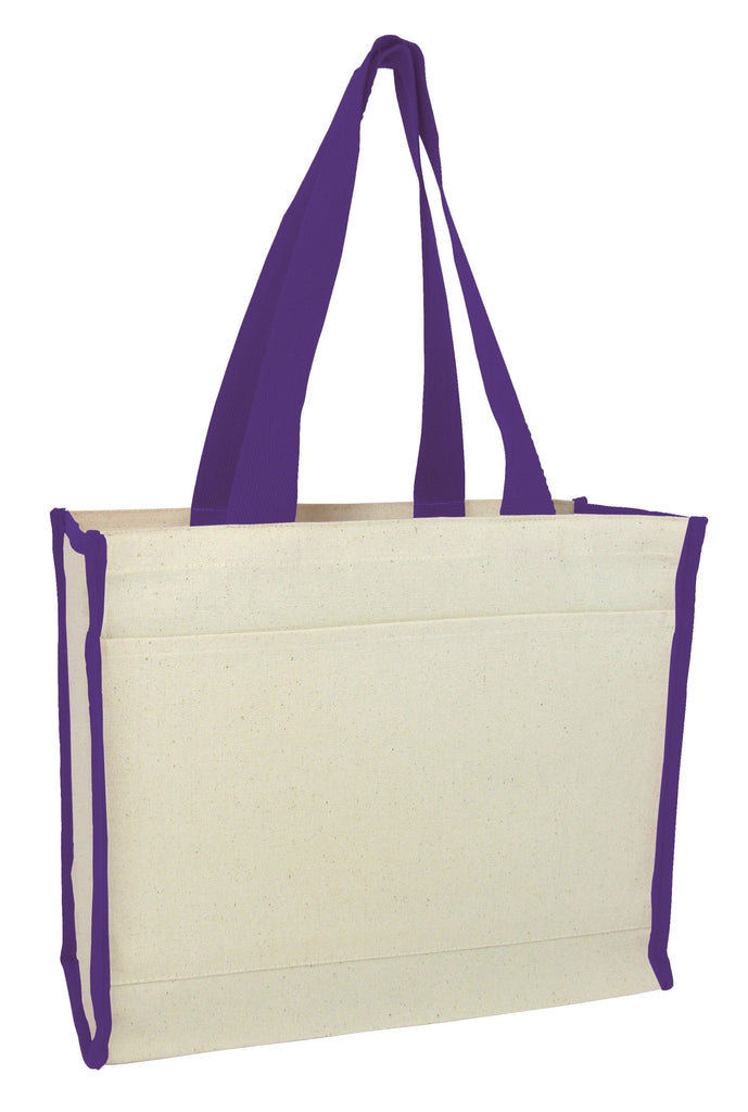 This tote bag comes in solid natural with colored trim for an elegant and simple look. The side pocket lets you store your magazine, keys, phone or other accessories with easy access. The full side and bottom gusset gives your bag shape and support at all times. Customize the look of this bag by added your logo or slogan for promotional purposes.