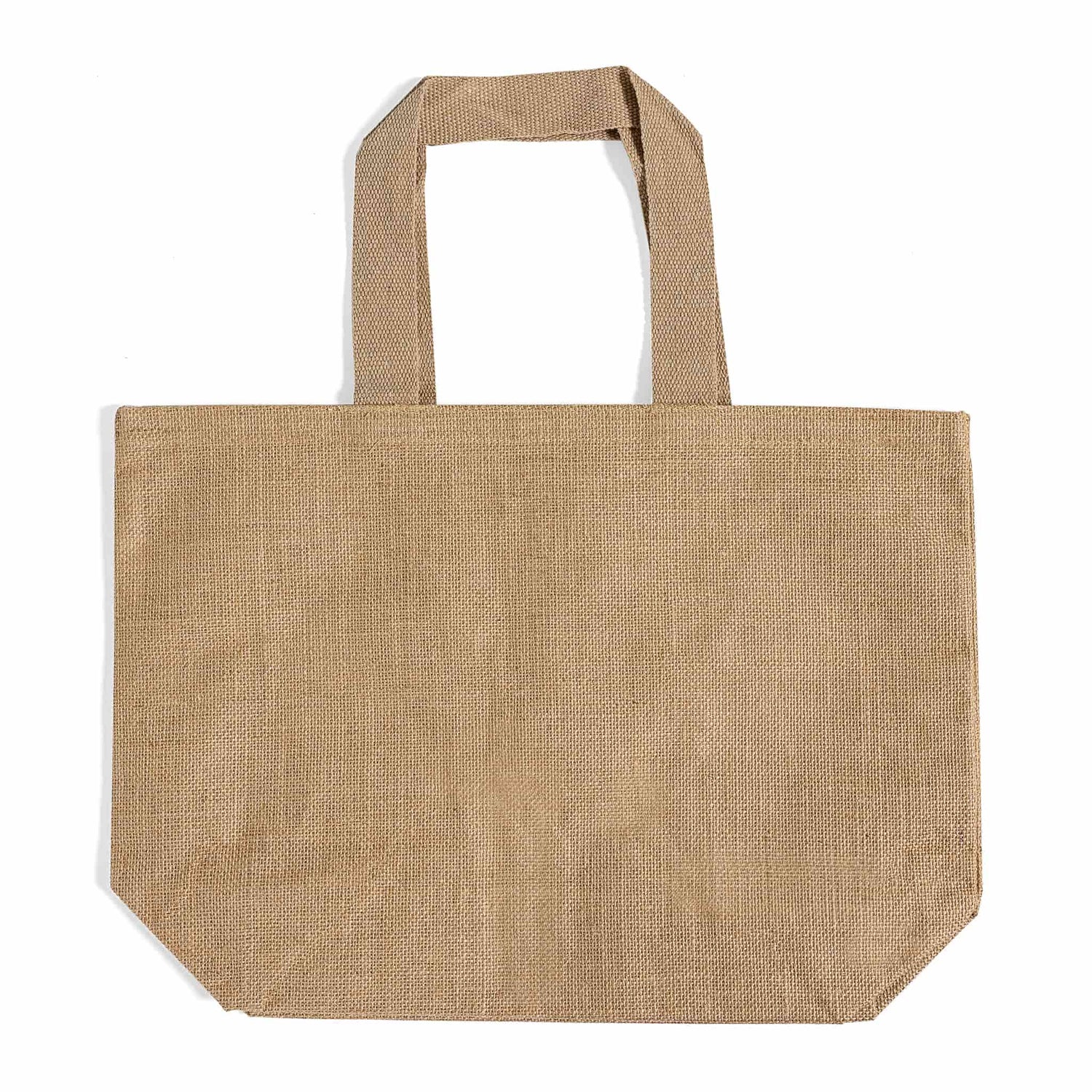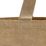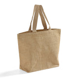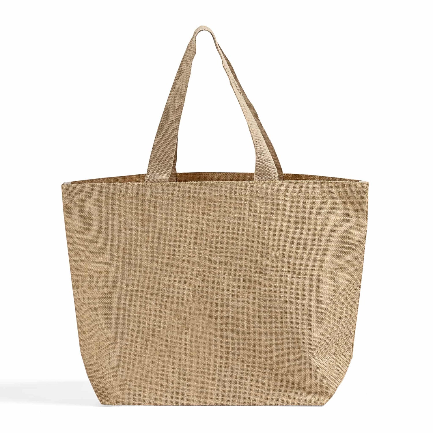 This reusable heavy-duty 100% natural jute shopping tote bag is made to last for years of use with reinforced stitching at the stress points for maximum durability. The inside of the bag is laminated with a clear coating of PVC to make it water-resistant. With soft cotton over-the-shoulder web handles long enough to go over your shoulder, it's perfect for carrying around town while you're running errands. This biodegradable, extremely durable burlap beach bag is ideal for shopping, work, school, beach or pool visits, organizing supplies, carrying groceries, books, bringing items to an outdoor event, creative decorations, arts and crafts projects, parties, weddings, and church events. Great for promotional needs, giveaways, advertising your business, and trade shows. It has a large imprint area for your logo, slogan, event, date, or other information to be silkscreen printed or embroidered on.