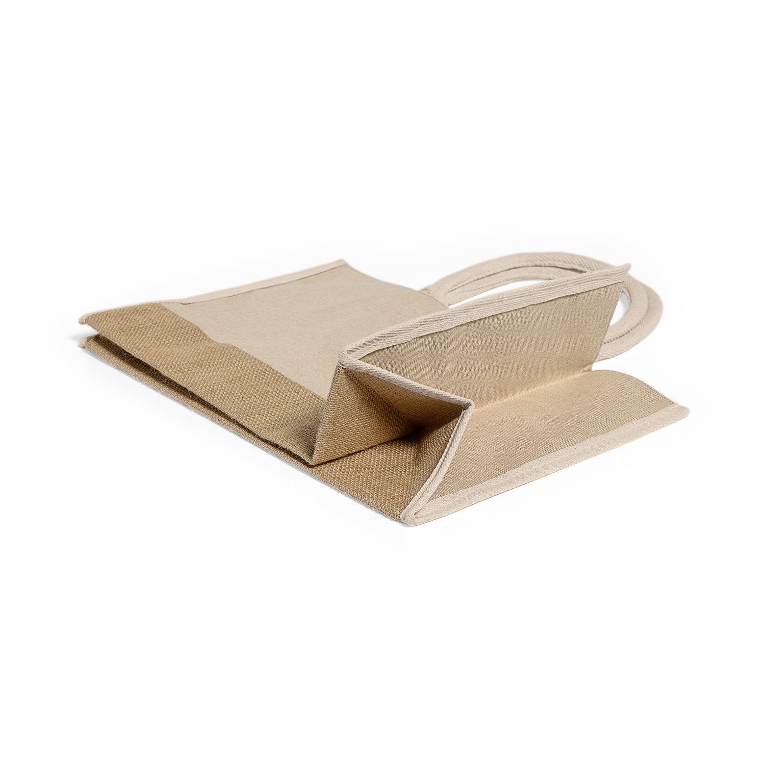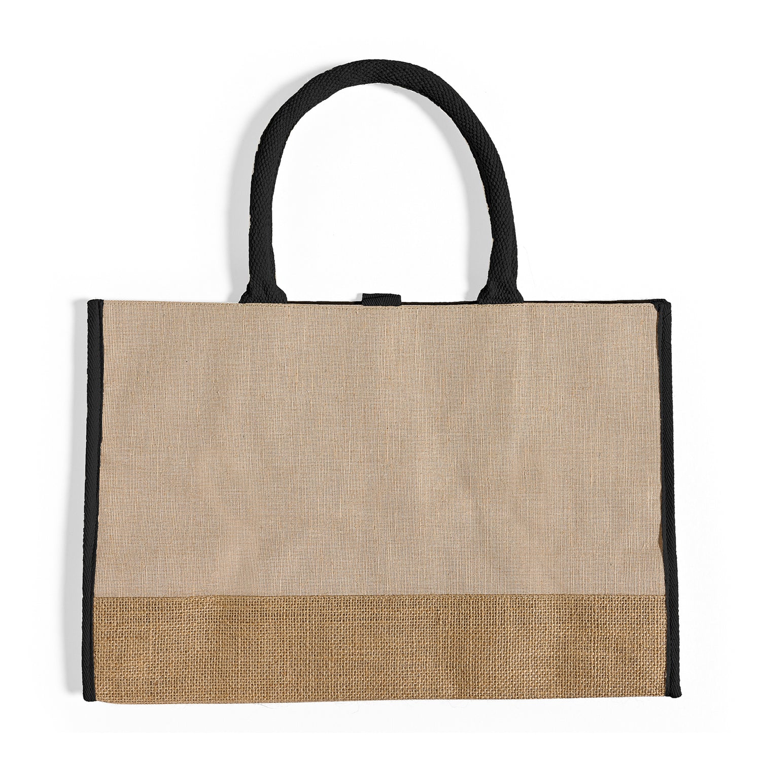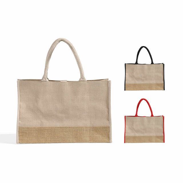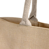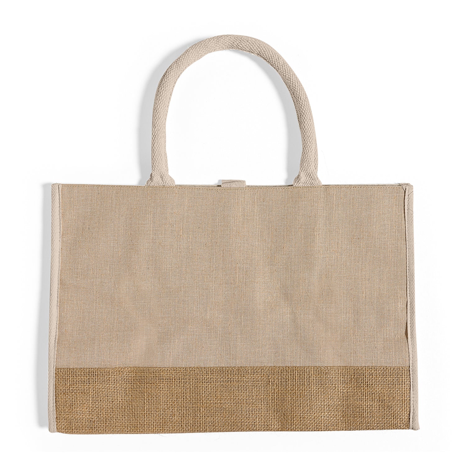 This large, heavy-duty two-colored burlap bag is made of a Jute and Cotton Blend. The fine combination of jute and cotton gives Juco (Jute & Cotton Mix) its edge with hard-wearing durability, a smooth touch, and detailed printing capabilities. Each bag includes matching thick rope handles and two lightweight woven straps that can be tied to close the top. This sturdy jute beach bag is perfect for grocery shopping, beach or pool visits, daily use, travel, work, arts & crafts, wedding favors, promotions, trade show giveaways, advertising your business, and fundraising needs. It also features a large area for printing your logo, slogan, event details, or other information via silkscreen or embroidery.